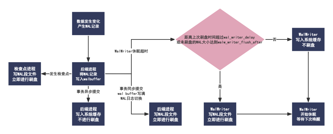 当没有发生后端进程和检查点主动刷盘时,walbuffer中没有落盘的WAL记录会等待WalWriter自动唤醒后才批量写入WAL日志。