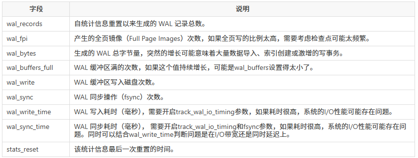 通过PostgreSQL中的pg_stat_wal视图,可以监控到与WAL生成和活动相关的关键统计信息,这些统计信息可以用于诊断数据库性能、I/O 瓶颈以及优化配置。