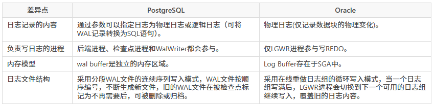 PostgreSQL的WAL和Oracle的Redo在核心概念上一致,都是预写式日志机制的实现,这是保证数据库事务持久性和崩溃恢复的基石。 但它们存在以下差别: