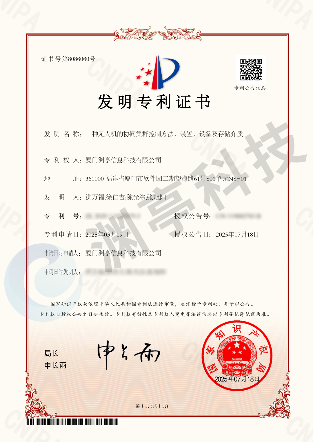 近日,渊亭科技在无人机集群控制领域取得创新突破,其自主研发的“一种无人机的协同集群控制方法、装置、设备及存储介质”荣获国家知识产权局发明专利授权。该专利提出了一套动态、弹性的协同控制方案,旨在解决现有的领航无人机和集群的通讯方式容易出现集群失控的问题。