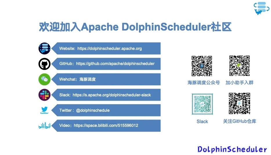 GitHub: https://github.com/apache/dolphinscheduler 官网:https://dolphinscheduler.apache.org/en-us 订阅开发者邮件:dev@dolphinscheduler@apache.org X.com:@DolphinSchedule YouTube:https://www.youtube.com/@apachedolphinscheduler Slack:https://join.slack.com/t/asf-dolphinscheduler/shared_invite/zt-1cmrxsio1-nJHxRJa44jfkrNL_Nsy9Qg