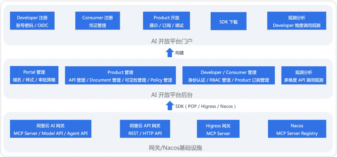 AI 开放平台管理后台 (for 管理员/运营):在这里将底层的模型服务、MCP Server、Agent 等多样化的 AI 能力,以 API 的形式轻松打包成标准化的“AI 产品”,并配上完善的文档、示例,最终一键发布到门户。 AI 开放平台门户 (for 开发者):门户是面向内外开发者的“店面”。开发者可以在此完成开发者注册、创建消费者、获取凭证、浏览和订阅 AI 产品、在线测试,并清晰地监控自己的调用状态和成本。 AI 网关:作为 Higress 社区的子项目,Higress AI 网关承载所有 AI 调用的认证、安全、流控、协议转换以及可观测性等能力。 Nacos:Nacos 作为 MCP Registry 为门户提供全面的 MCP Server 元信息托管,版本管理,服务发现,密钥托管等能力。通过动态服务发现和动态配置变更实现系统灵活扩展和变更,通过 Nacos MCP Router 智能路由简化多 MCP 服务管理和调用。在日常开发测试的场景中,通过动态 Prompt 变更实现高效的 MCP 服务调试,在生产环境中通过多版本管理实现灰度发布,通过加密存储和动态配置变更提升安全能力。