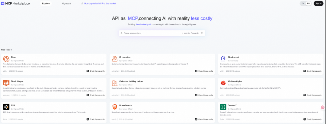HiMarket 可以帮助企业一键拉起私有化的MCP市场,例如 Higress 构建的开源 MCP 市场:https://mcp.higress.ai/
