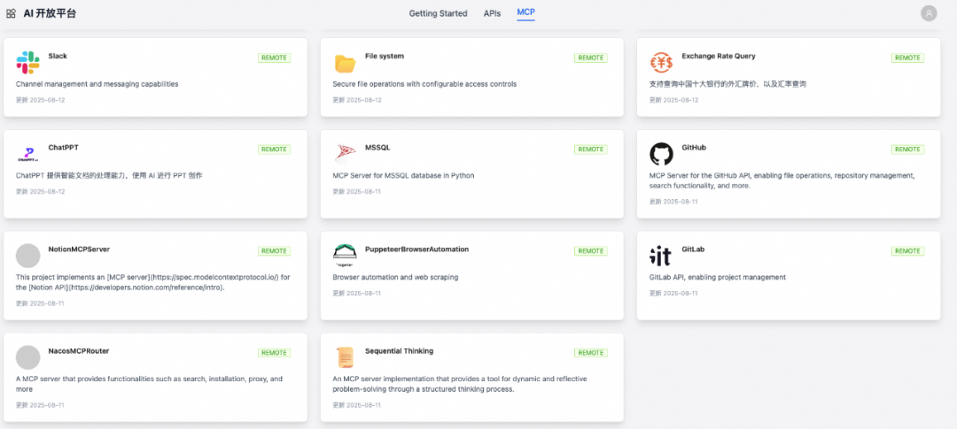 Phase 1 (当前):发布功能完整的开源 MVP 版本,与社区共同打磨,优化体验 Phase 2 (Q3 2025):可观测、计量计费、Rest API 拆分 Model API/Agent API、A2A 支持 Phase 3 (Q4 2025):MCP 质量工具、RBAC、门户 DIY、调试、SDK 生成