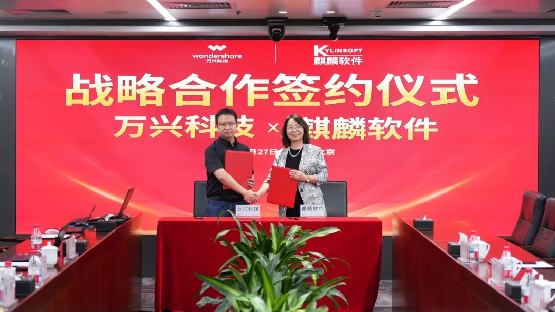 2025年8月27日,万兴科技与麒麟软件在京举行战略合作签约仪式。万兴科技线下营销中心总经理唐芳鑫、麒麟软件生态合作部总经理姚翎作为双方代表签署战略合作协议。