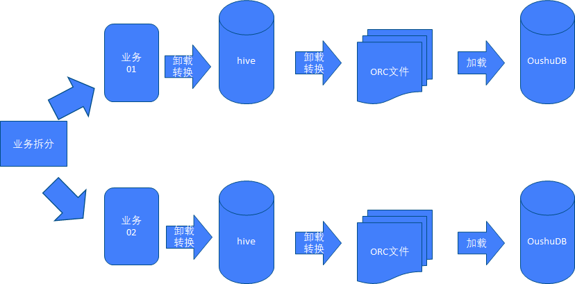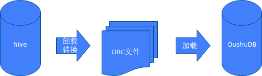 整体批量迁移的方式是通过一些批量脚本在hive中卸载数据、抽取到OushuDB中,然后直接在OushuDB中装载到对应的目标库中,等待数据装载完毕,OushuDB中的新系统即可以开始启动相应的跑批程序进行并行跑批。