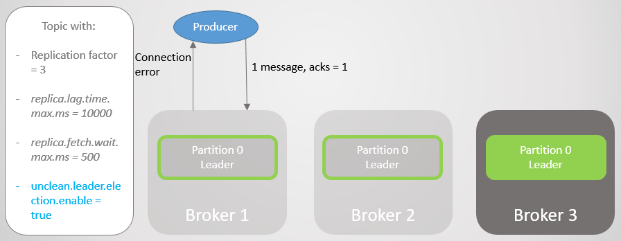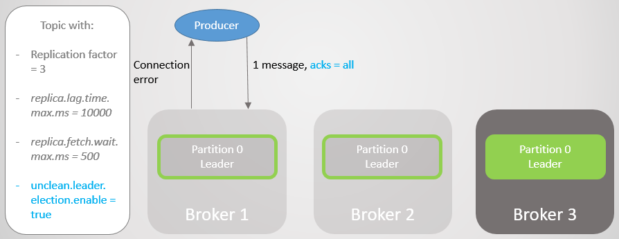 这个时候broker 2失效,生产端将出现连接错误。与此同时在丢失123条数据的情况下新的leader切换到broker 1。在发生故障切换时,虽然broker 1在ISR列表中,但由于数据不是完全同步,仍然会出现数据丢失。