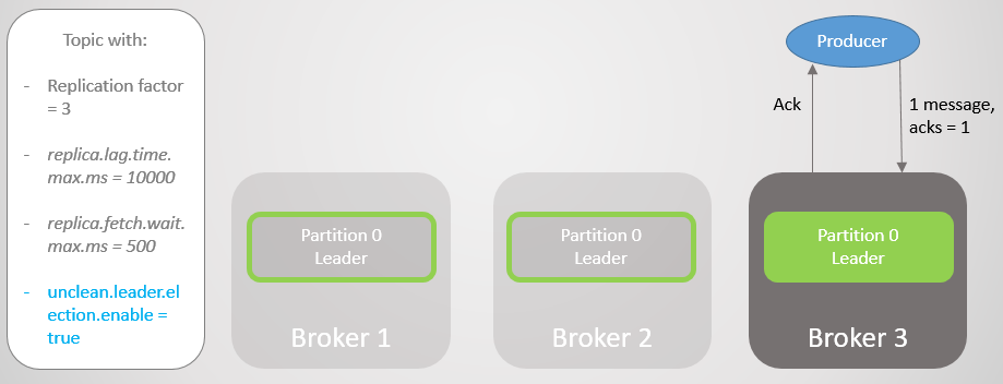 在本案例中,我们可以看到在持久化数据的时候当leader不再等待follower的情况下,leader发生故障切换极有可能导致数据丢失。是否允许在故障切换中将新leader切换到数据不同步的follower可以通过配置参数unclean.leader.election.enable来控制,其缺省值是false,缺省不允许将leader切换到不同步的follower。