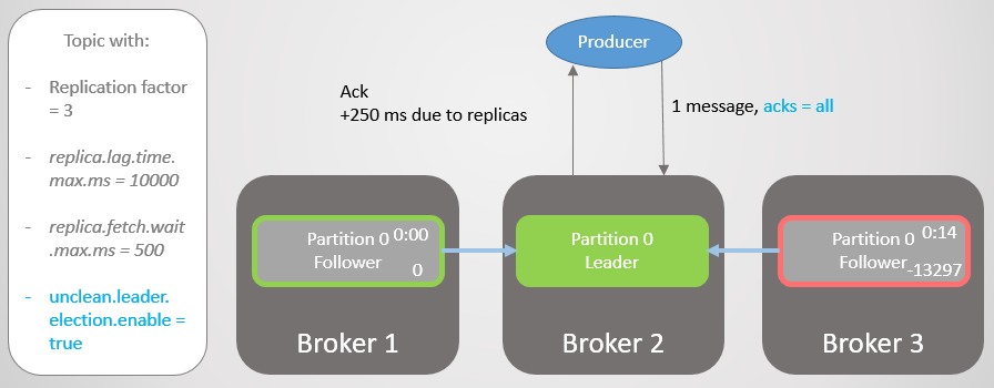 在本次测试中我们在生产端设置acks=1,这也是大多数生产端的缺省设置。我们的数据分区分布在所有的3个broker上。Broker 3已经出现数据延迟,它最新的数据是leader 8秒以前的,具体落后7456条数据。Borker 1相对来说要快的多,最新数据与leader只相差1秒,数据落后123条。由于我们设置acks=1,因此生产端在发送数据后,数据在leader副本所在的broker 2上写入成功生产端即可接收到ack,完全无需等待任何follower的操作结果,这是非常迅速的。