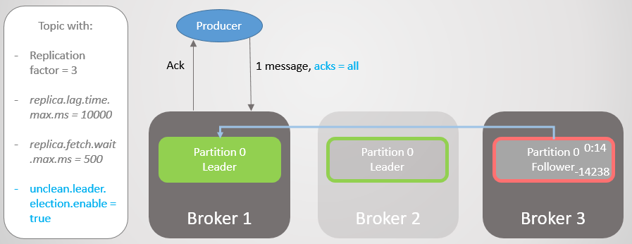 Broker 3的延迟进一步加大。时间延迟达到14秒,数据延迟达到15286。它虽然仍在向leader发出fetch操作的请求,却始终不能跟上leader的脚步。这可能是由于两个broker之间的网络或者存储出现故障所导致。最终broker 3从ISR列表中被leader移除。现在在ISR中就只有一个数据副本存在,就是leader本身!生产端仍然继续发送数据同时接收确认。