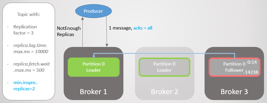 Broker 2出现故障,触发leader切换,新的leader切换到broker 1,期间没有发生数据丢失。这时ISR中将只包含一个数据副本broker 1。这已经低于确保数据冗余性的最小同步数据副本数(min.insync.replicas=2),因此在新数据写入时生产端将产生NotEnoughReplicas或NotEnoughReplicasAfterAppend的异常。