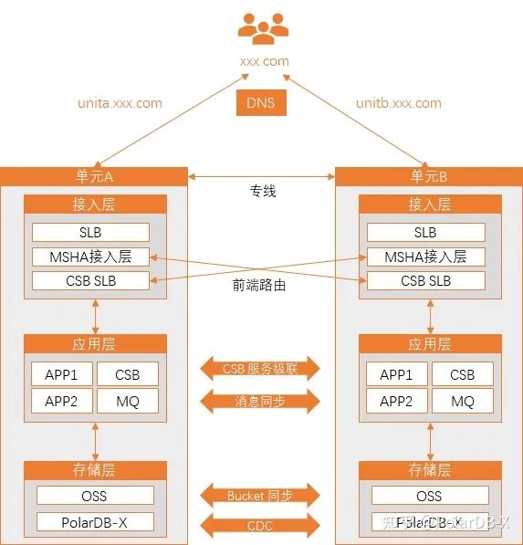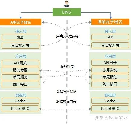 在这个例子中,单元切分维度为省份。DNS按地域分流,接入层按照路由规则判断和纠错。应用层单元化部署,服务发现实现双中心的服务同步能力。两个单元的PolarDB-X实例进行双向同步,实现数据最终一致性。