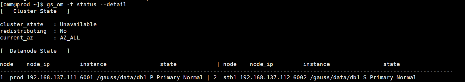 命令:gs_om -t status –detail ------此命令常用,使用频率高