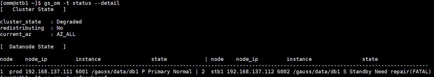 cluster_state:Degraded ------表示openGauss可用,但存在故障的数据库节点实例