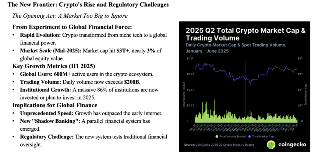截至 2025 年中,加密市场总市值突破 3 万亿美元,几乎占全球股票总市值的 3%,全球活跃用户超过 6 亿,每日交易量突破 2000 亿美元。Coinbase 和安永⼀份调研报告显示,有 85% 的机构正在或计划配置加密资产。