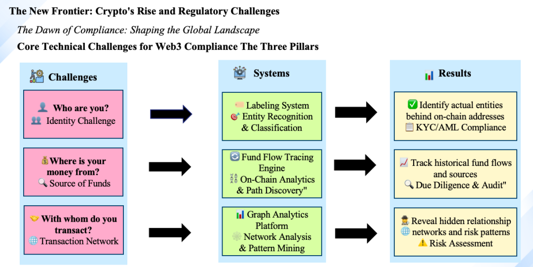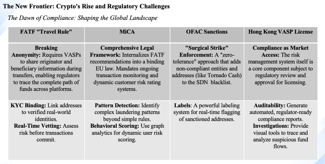 正是在这样的背景下,合规的曙光开始照亮全球加密领域。FATF 的"旅行规则"、欧盟 MiCA 法案、OFAC 制裁等监管框架逐步形成,对加密风控技术提出了三大核心挑战: