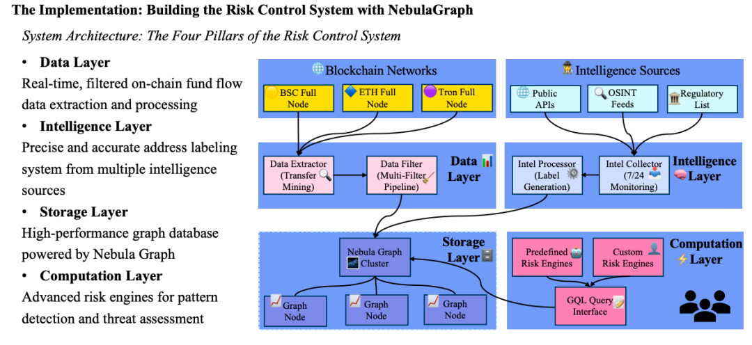 存储层(Storage Layer)是系统的核心基础设施,由 NebulaGraph 提供支持。选择NebulaGraph 的原因在于其卓越的图数据存储和查询能力,能够高效地处理海量的地址和交易关系,为风险网络构建提供坚实基础。