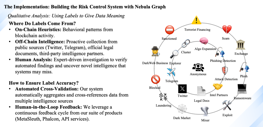 链上启发式(On-Chain Heuristics):分析区块链上的行为模式,构建钓鱼检测引擎和攻击检测引擎,对钓鱼地址和攻击交易进行识别。 链下情报(Off-Chain Intelligence):从公开渠道收集信息,包括社交媒体(Twitter, Telegram)、官方法律文件以及与第三方情报合作伙伴的协作。如果一个地址被官方机构列为制裁对象,或在公开社区被广泛确认为黑客攻击者,就会被打上相应标签。 人工分析(Human Analysis):作为自动化系统的重要补充,专家团队进行深入调查,验证自动化发现,并发现系统可能遗漏的新型、复杂的犯罪模式。