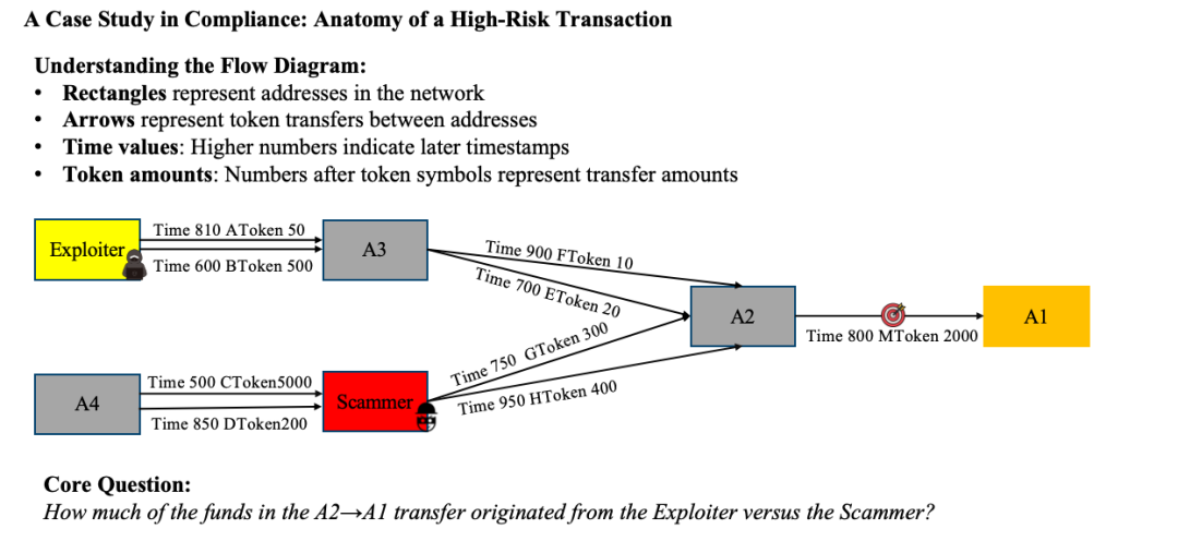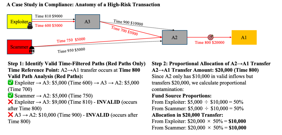 核心问题是:A2 到 A1 的转账中,有多少美元来源于"Exploiter",有多少来源于"Scammer"?