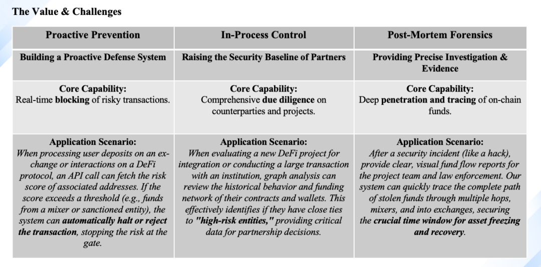 核心能力是交易对手与项目的尽职调查(Due Diligence)。当评估一个新的 DeFi 项目进行集成、或与某个机构进行大额交易时,可以通过图分析全面审查其合约地址、主要钱包的历史行为和资金网络。这能有效识别其是否与"高风险实体"有紧密关联,为合作决策提供关键依据。