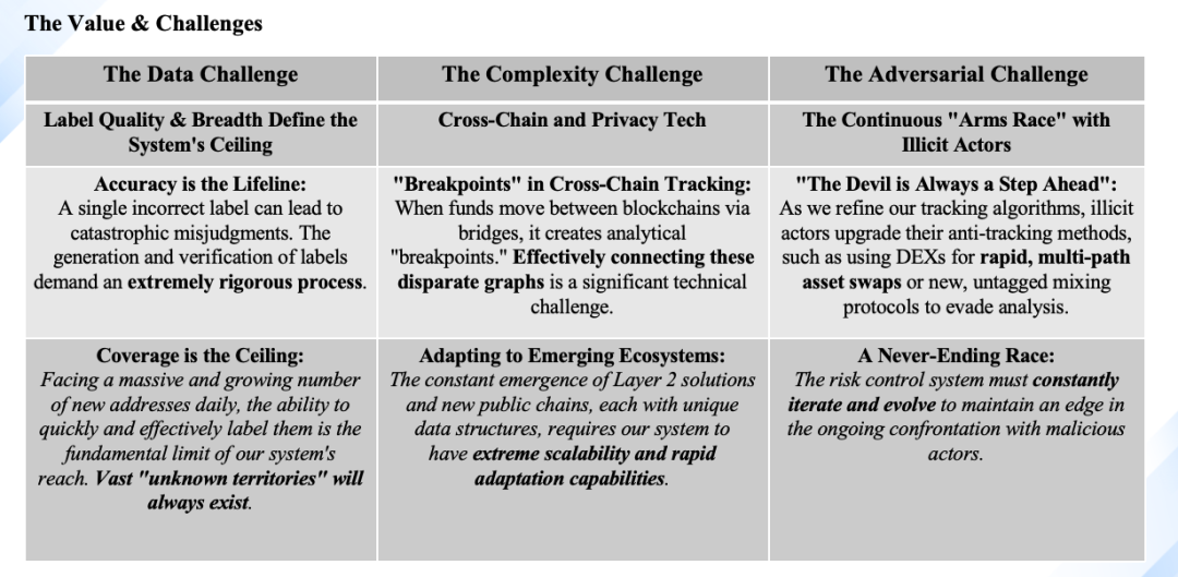 准确性是生命线:一个错误的标签(如将普通地址误标为黑客)可能导致灾难性误判。标签的生成和验证需要极其严谨的流程。覆盖度是天花板:面对每天都在增长的海量新地址,如何快速、有效地识别并打上标签,是系统能力所能触及范围的根本限制。