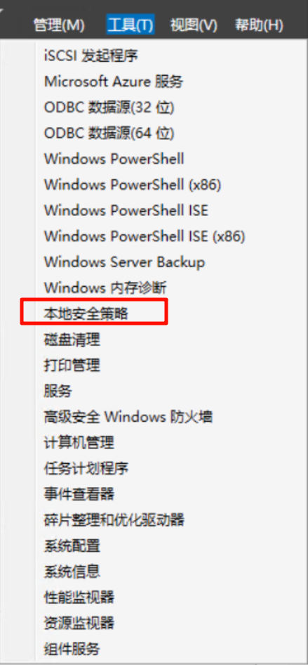 打开本地安全策略管理器:服务器管理器 → 本地服务器 → 工具 → 本地安全策略