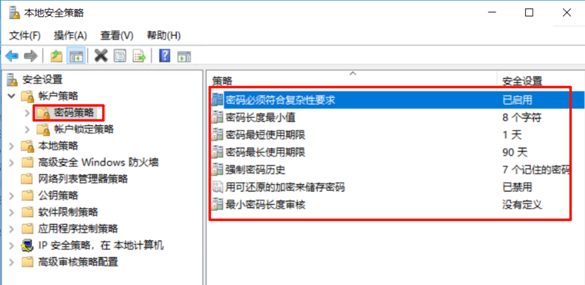 导航至密码策略:安全设置 → 账户策略 → 密码策略