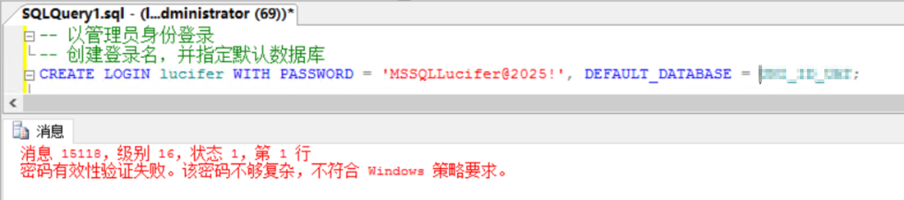 SQL Server 数据库的密码策略继承自 Windows 操作系统的安全策略,而非独立配置。遇到密码复杂度问题时,应当: