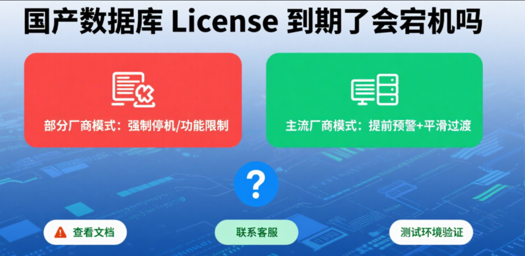 那么 License 要是过期了怎么办?有江湖传言,说国产数据库的 License 到期立马就会关闭数据库,不给你用了,真的是那样的吗?欢迎生产环境使用过的朋友一起来评论区聊聊。目前我只接触到头部的两家集中式数据库,当 License 过期后并没有直接关库,而是可以正常使用,一家仅在日志中提示,重启也可以正常启动,另一家仅在登录的时候提示,但要是重启那么就无法正常启动了。