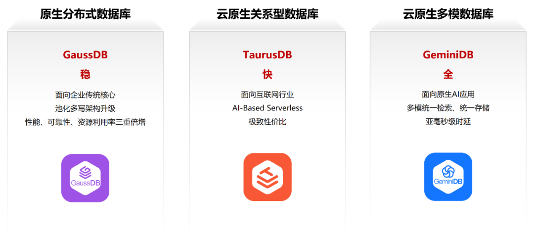 这几个趋势催生了新的数据库技术,这也是整个华为云数据库未来产品的演讲方向,我们认为也是新一代云原生数据库典型的特征。面向这些行业趋势,华为云三大系列产品今年做了全系升级: