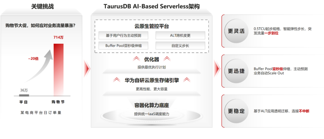 AI-Based Serverless也是重点。我们把AI融入到Serverless里,基于用户行为做主动预测,提前做弹性,保证弹得更快。传统Serverless弹性以1TCO或者0.5TCO的力度弹,遇到流量高峰需要一步一步弹,TaurusDB基于智能步长可以一步弹到位,更快速地匹配客户的业务流量高峰,同时跟应用无损透明ALT技术结合,当出现跨机弹性时保证应用连接不中断,这是我们相比业界其他Serverless的差异化竞争力。