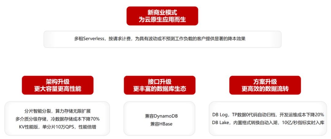 “三升级”一是架构升级,针对DynamoDB场景,升级为多租Serverless架构,按读和写的请求计费,为业务具有波动的客户提供显著的降本效果。针对KV场景,今年支持了分片智能分裂,不管流量怎么激增,计算和存储都可以无限扩展。今年还会推出KV高性能版,单分片做到10万QPS,整体性能比开源Redis提升两倍。