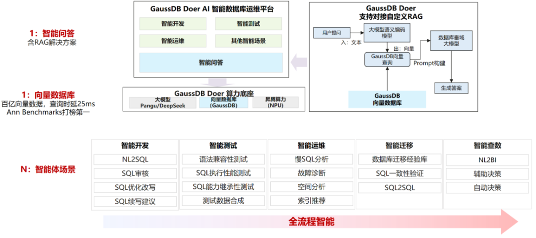 在工具方面,今年发布了GaussDB Doer智能助手,做到从开发、测试、迁移、运维全流程智能,同时维护零人工干预,让用GaussDB的客户不再依赖原厂服务,用GaussDB Doer即可搞定很多运维问题。GaussDB Doer采用“1+1+N”的架构: