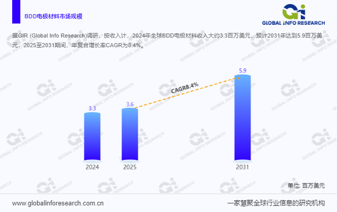 据GIR(Global Info Research)调研显示,从收入层面来看,2024年全球BDD电极材料收入约为330万美元,预计到2031年将增长至590万美元。在2025年至2031年期间,其年复合增长率(CAGR)为8.4%。