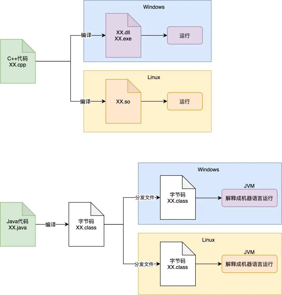 Java 是一门面向对象,静态类型的语言,具有跨平台的特点,与 C,C++ 这些需要手动管理内存,编译型的语言不同,它是解释型的,具有跨平台和自动垃圾回收的特点,那么它的跨平台到底是怎么实现的呢?