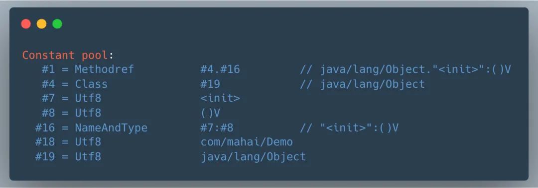 可以看到这些字面量代表的含义,#1,#2 这种数字形式的表示形式也被称为符号引用,程序运行期会将符号引用转换为直接引用