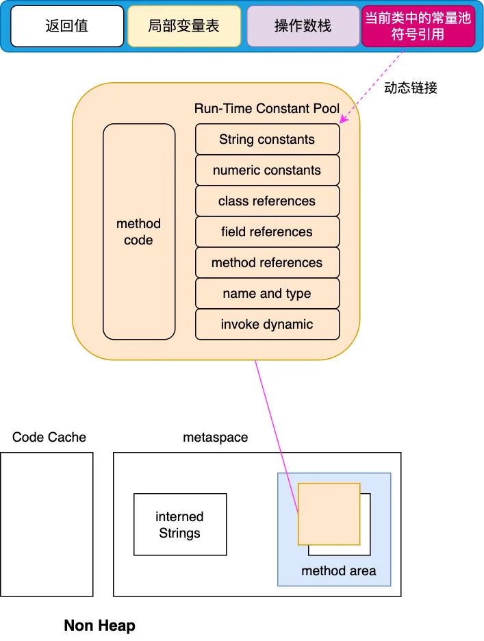 可以看到 Object 的 init 方法是由 #4.#16 表示的,而 #4 又指向了 #19,#19 表示 Object,#16 又指向了 #7.#8,#7 指向了方法名,#8 指向了 ()V(表示方法的返回值为 void,且无方法参数),字节码加载后,会把类信息加载到元空间(Java 8 以后)中的方法区中,动态链接会把这些符号引用替换为调用方法的直接引用,如下图示