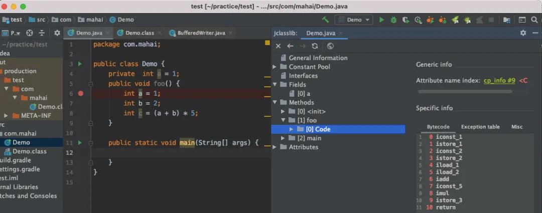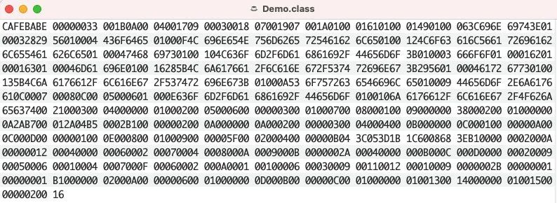 执行 javac Demo.java 后可以看到其字节码如下