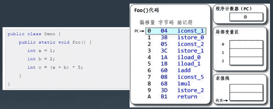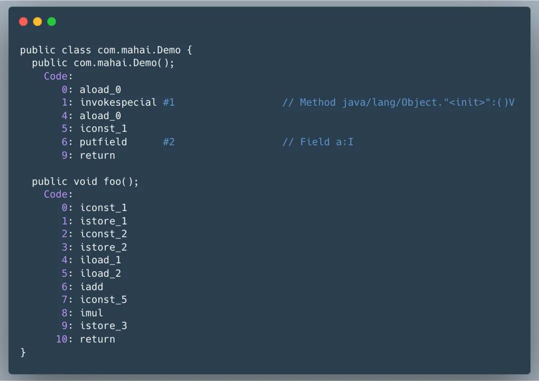 注意线程中还有一个「PC 程序计数器」,是每个线程独有的,记录着当前线程所执行的字节码的行号指示器,也就是指向下一条指令的地址,也就是将执行的指令代码。由执行引擎读取下一条指令。我们先来看下看一下字节码长啥样。假设我们有以下 Java 代码