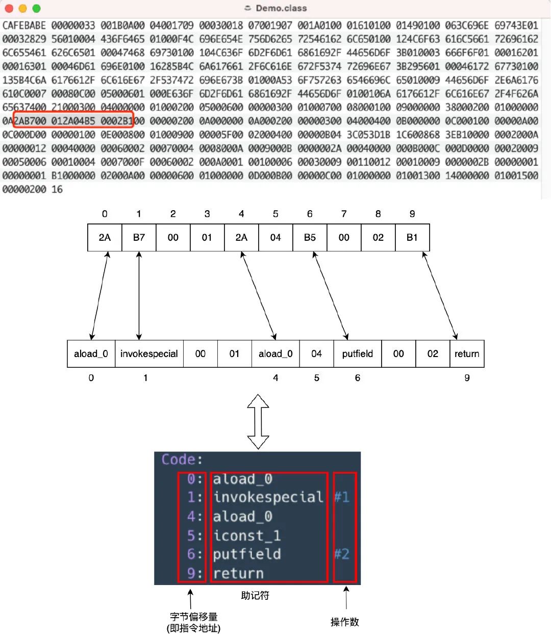 至此我们不难明白 javap 的作用了,它主要就是找到字节码对应的的助记符然后再展示在我们面前的,我们简单看下上述的默认构造方法是如何根据字节码映射成助记符并最终呈现在我们面前的: