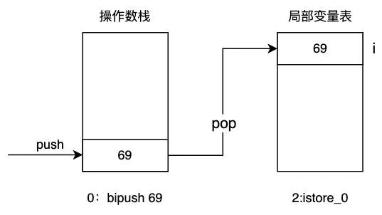 可以看到主要分两步:第一步首先把 69 这个 int 值压栈,然后再弹栈,把 69 弹出放到局部变量表 i 对应的位置,istore_0 表示弹栈,将其从操作数栈中弹出整型数字存储到本地变量中,0 表示本地变量在局部变量表的第 0 个 slot