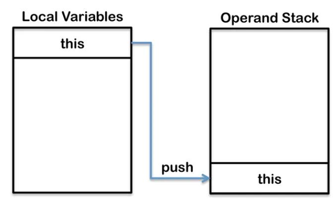 第一条命令 aload_0,表示从局部变量表中加载第 0 个 slot 中的对象引用到操作数栈的栈顶,也就是将 this 加载到栈顶,如下