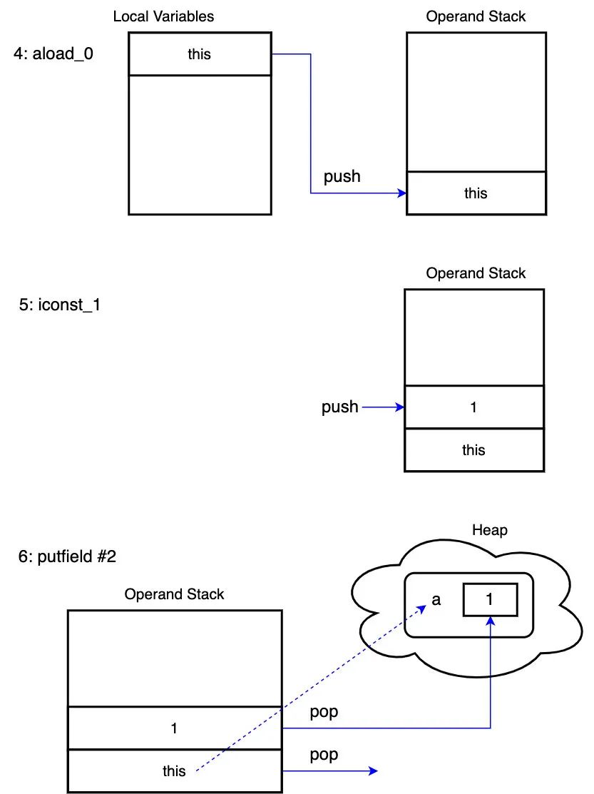 putfield:它接受一个操作数,这个操作数引用的是运行时常量池里的一个字段,在这里这个字段是 a。赋给这个字段的值,以及包含这个字段的对象引用,在执行这条指令的时候,都会从操作数栈顶上 pop 出来。前面的 aload_0 指令已经把包含这个字段的对象(this)压到操作数栈上了,而后面的 iconst_1 又把 1 压到栈里。最后 putfield 指令会将这两个值从栈顶弹出。执行完的结果就是这个对象的 a 这个字段的值更新成了 1。