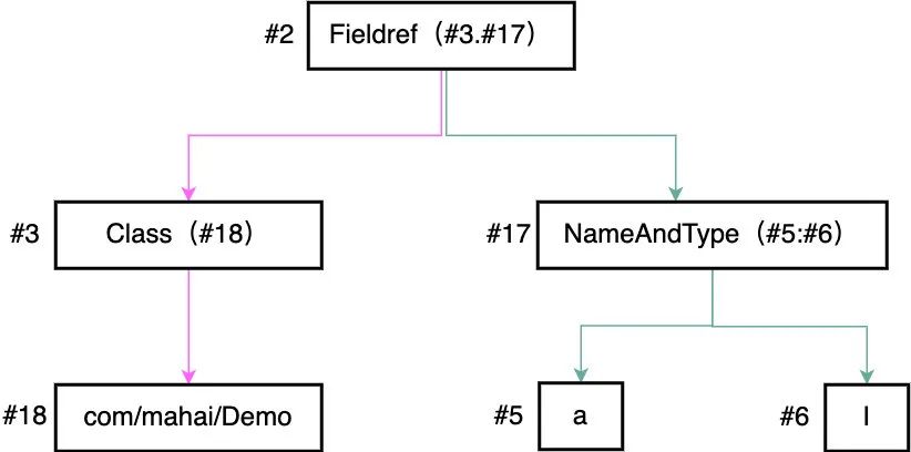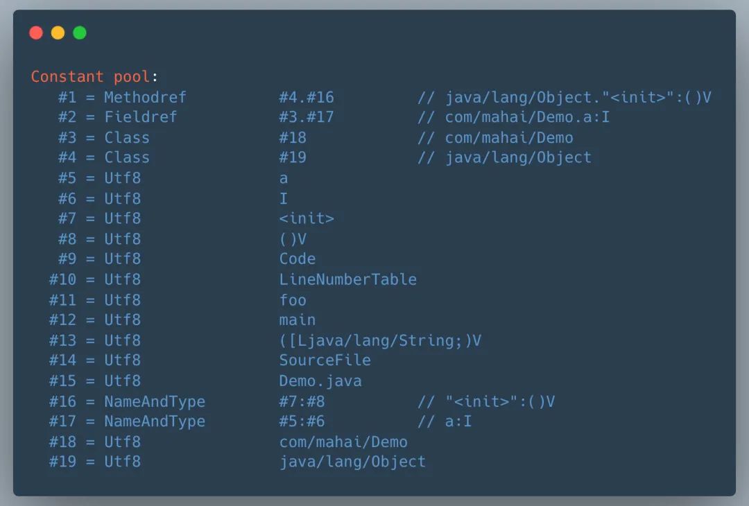 命令中的 #2 怎么就代表 Demo 的私有成员 a 了,这就涉及到字节码中的常量池概念了,我们执行 javap -verbose path/Demo.class