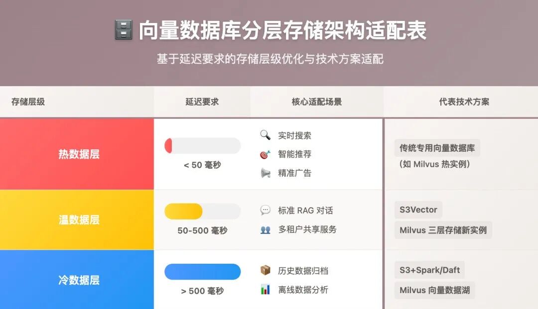 第 3 代(2024 年起):分层存储时代这一时期,像 TurboPuffer 这些新玩家,直接把 索引放到了 S3 里,存储成本降到 $0.33/GB/ 月,又比之前省了 10 倍!但缺点也明显:查冷数据(不常用的数据)要等 500 毫秒~1 秒,召回率也没那么高。