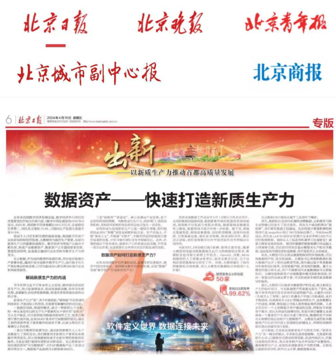 数字生产力之新,在于科技创新。北京日报重磅推出的“新质生产力”系列报道中这样说到:“近年来我国数字经济蓬勃发展,政策支持显著提升,数字中国加快建设。如何掘金数字经济新机遇,实现“数据”变成“数字资产”打造新质生产力?”天云数据,作为国内数智科技提供商,充分发挥数据生产要素价值,撬动行业全面跃升数字生产力,运行数字化生产流程推动科技变革,已经为超过50+家世界500强企业及机构提供服务。