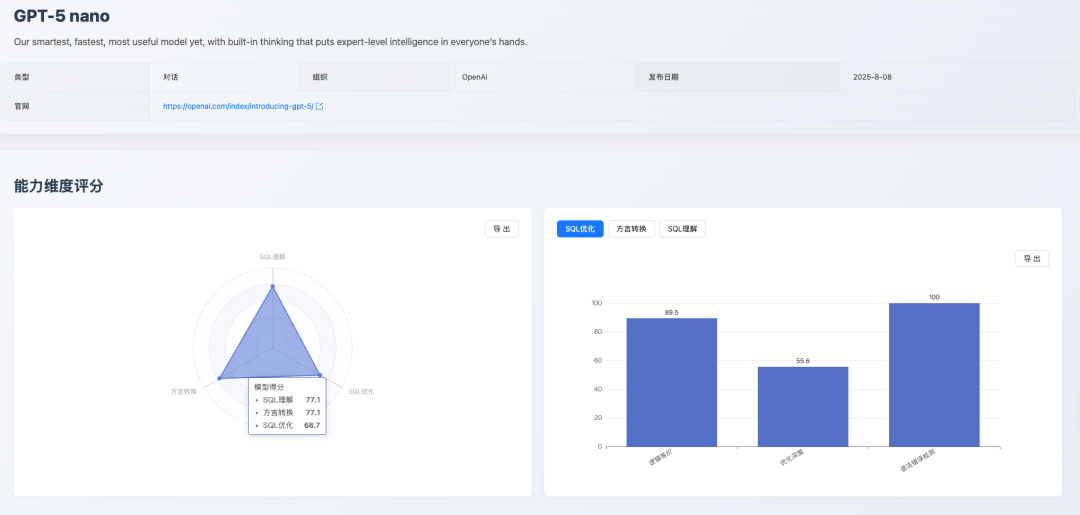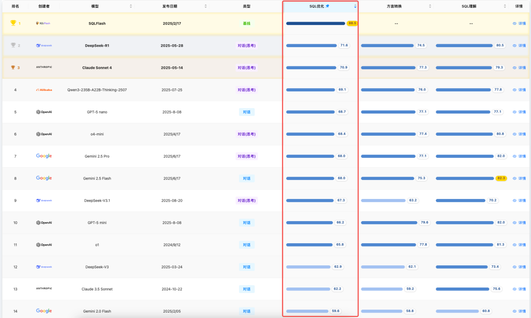 简评:专用优化模型 SQLFlash 以 88.5 分的显著高分继续保持该维度榜首,与其他模型拉开较大差距。新模型中,gpt-5-nano 以其在语法可靠性上的高分进入前五。评测结果显示,通用大模型在深度优化能力上与专用模型相比仍存在明显差距。