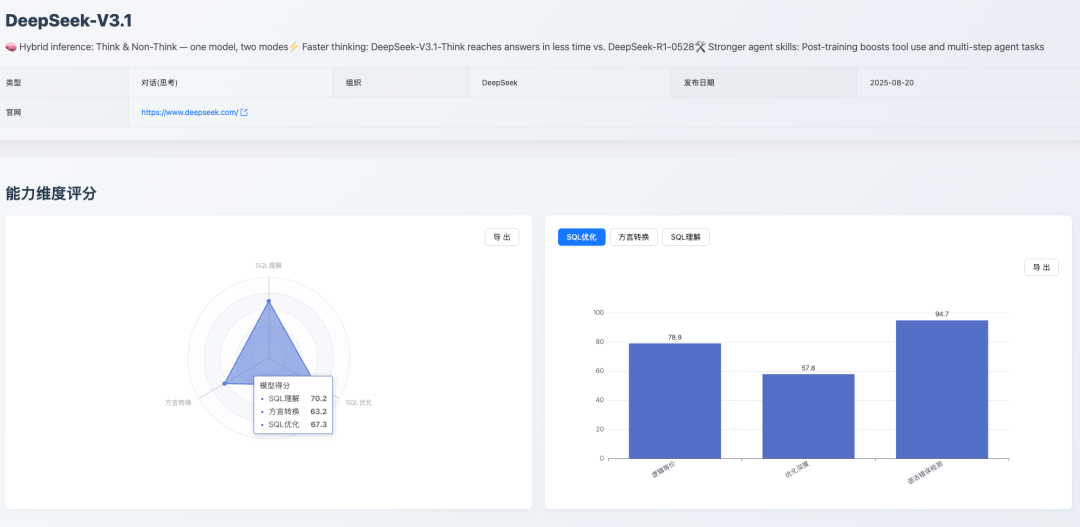 DeepSeek-V3.1 在 SQL 理解、优化 和 方言转换 三大维度上展现了较为均衡的实力,在特定场景如 国产数据库转换 中表现完美,但在处理超长复杂查询和深度优化方面仍有提升空间。