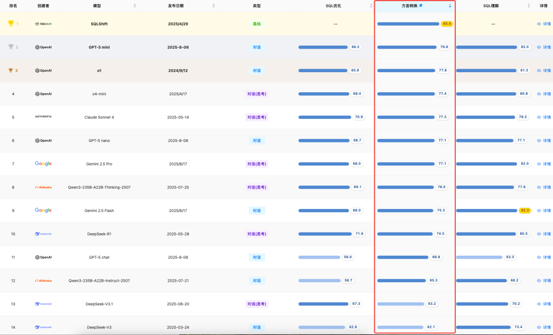 相较于上一期也就是第一期 SCALE 榜单,本期最大的变化则是 8 月新发布的几个模型,来自 OpenAI 的 GPT-5 家族 和深度求索的 DeepSeek-V3.1,虽然新的模型在通用领域展现出了不小的进步,但是 SQL 理解能力和 SQL 优化能力专项领域中并没有对上一期榜单上的领跑集团形成反超,可见在特定领域中,一些模型还是有其深耕出来的优势;另一个比较让人惊讶的是 DeepSeek-V3.1 也没有对 DeepSeek-R1 形成反超,可见模型的新旧与其能力不一定存在必然关系,其设计、算法、数据质量与规模、训练过程、微调对齐、任务特性等因素带来的影响会更大。而在 SQL 方言转换能力上,本期新加入排行第二的 GPT-5 mini,超越了上期榜单的参与者,可见模型的进步对语言类的处理能力提升较大;同样新入榜单的 SQLShift 则以 83.4 的高分一骑绝尘,作为一款专门用于 SQL 方言改写的工具,其在该专项领域展现出了的统治力也展现出针对特定任务专门设计的工具也能在一众优秀的 AI 模型中闯出一片天地。