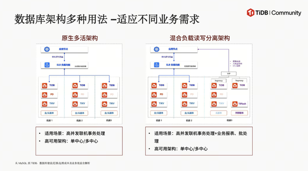 相比于 MySQL,TiDB 的分布式架构支持多种使用方式,满足不同业务需求。原生多活架构下,所有节点可读可写,适用于高并发联机事务处理场景,提供高可用性和性能保障;混合负载读写分离架构则将联机读写和报表查询等不同负载分离,优化资源利用,适用于高并发联机事务处理与业务报表、批处理混合场景。